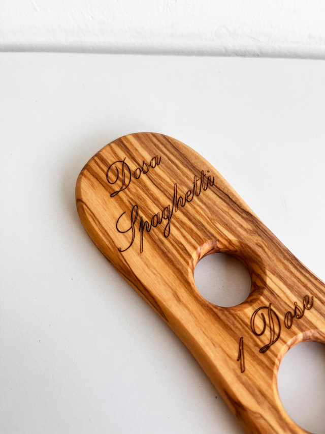 オリーブの木で造られたパスタ・スケール (筆記体文字)